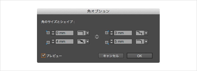 角の効果は、[オブジェクト]メニューから[角オプション]を選択して、[角オプション]ダイアログからも設定できます