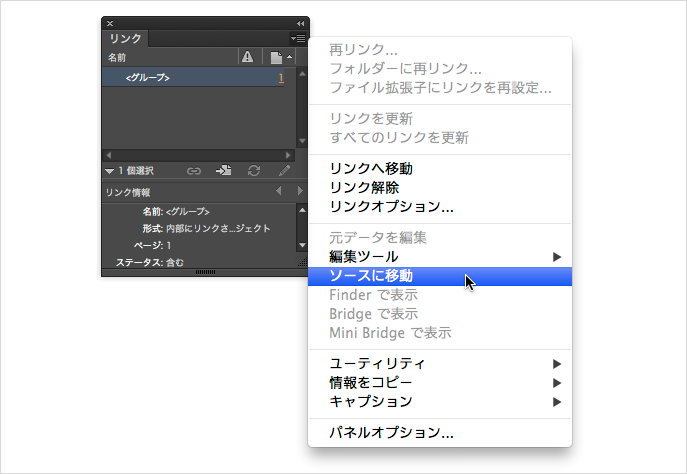 コンテンツ収集(配置)ツールで運用しているオブジェクトの修正は、必ず親のオブジェクトを修正する必要があり、子のオブジェクトの修正は、他のオブジェクトに反映できません。どのオブジェクトが親か分からない場合には、いずれかのオブジェクトを選択した状態で、[リンク]パネルから[ソースに移動]を実行します。親のオブジェクトが選択された状態で、ウィンドウ内に表示されます。