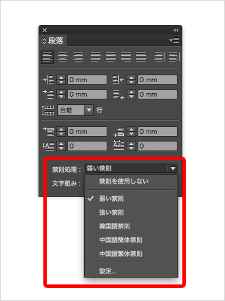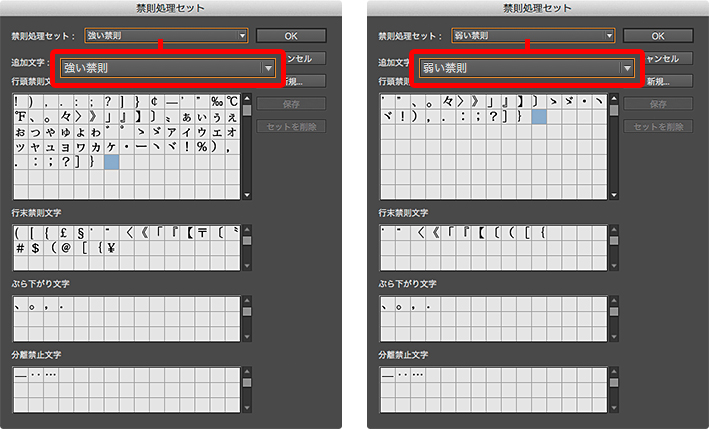[強い禁則]と[弱い禁則]。行頭禁則文字に拗促音が含まれるか、含まれないかが大きく異なります