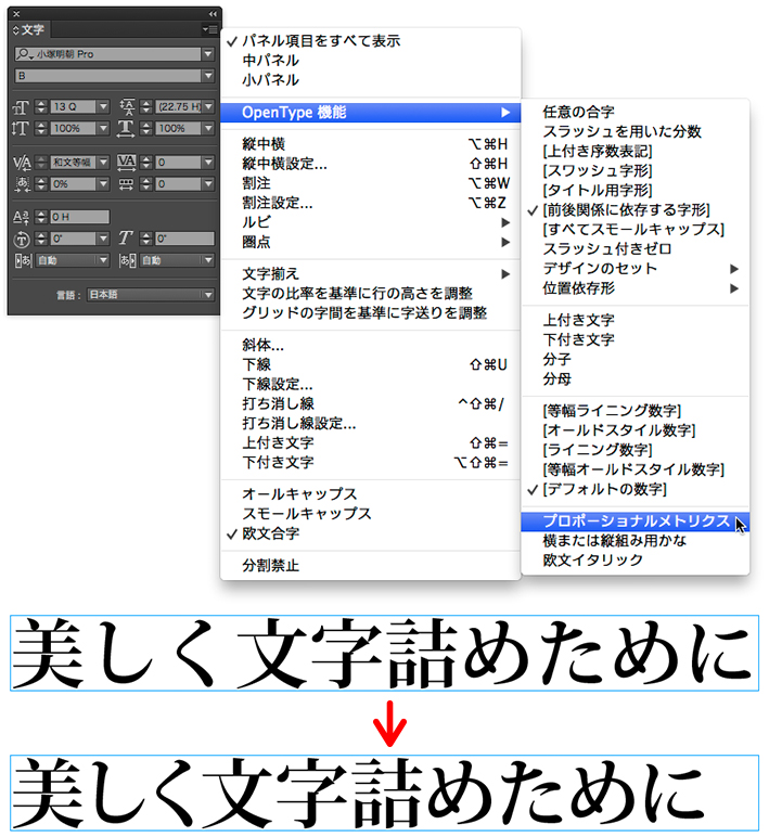 なお、いずれの詰め機能を使用したとしても、最終的に詰まり具合に納得がいかない場合には、手詰めで調整する必要があるかもしれません。その場合には[カーニング]や[字送り(トラッキング)]等で調整してください。 ここでは、いくつかの詰め機能をご紹介していきます。