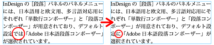 [単数行コンポーザー]は、どこで改行するかの判断を1行単位で行っています。それに対し、[段落コンポーザー]では改行位置を段落単位で決定しており、極端に字間のアキの広い行がないよう、各行のアキをできるだけ均等にしようと調整を行います。そのため、テキストの追加や修正を行うと、段落単位で再調整が行われ、修正をした行よりも前の行であっても、改行位置が変わるケースがあるのです。