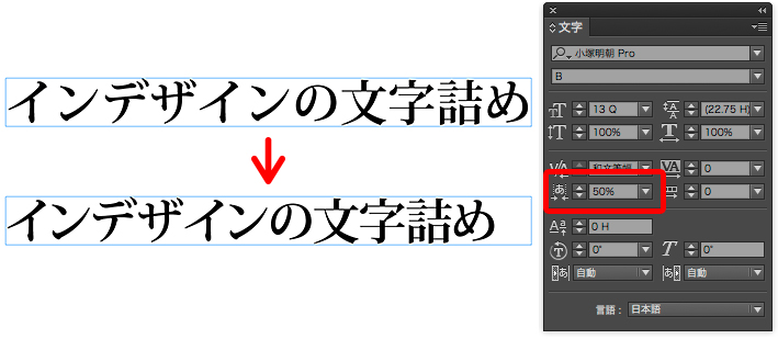 プロポーショナル詰めでお勧めなのが、[文字]パネルに実装されている[文字ツメ]です。文字の仮想ボディと字面との間隔を詰めることで文字詰めを実現しているため、後の文字との間隔だけでなく、前の文字との間隔も詰めることができます。均等配置(箱組み)の場合には、行頭や行末のアキも詰めることが可能で、0%~100%の間で詰め幅の調整ができます。図は[文字ツメ]を「50%」適用したもの。