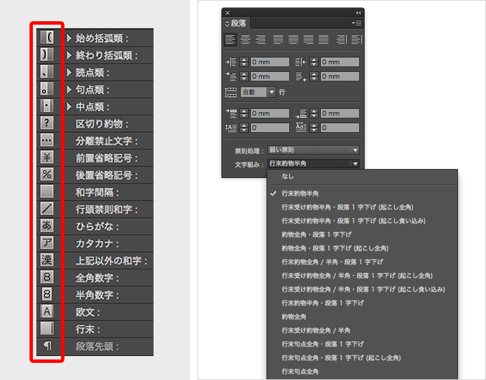 日本語組版には「句読点は行頭にきてはいけない」「始め括弧類は行末にきてはいけない」といったような、さまざまな組版ルールがあります。これらの組版ルールをひとつにまとめたものが[禁則処理セット]です。
