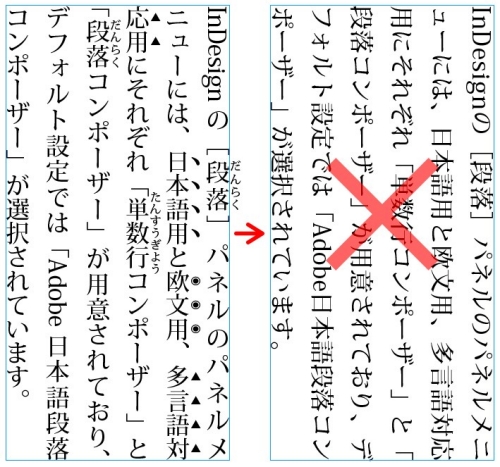 [Adobe日本語段落コンポーザー](左)を[Adobe欧文段落コンポーザー](右)に変更したもの。和文テキストに欧文用のコンポーザーを適用すると、縦組みをはじめ、ルビや圏点など、日本語専用の機能はすべてスキップされます。欧文用のコンポーザーは、欧文のみのテキストに対して適用するようにしましょう