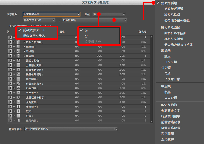 そこで、InDesignでは文字をいくつかのグループに分け、グループとグループが並んだ際のアキ量を設定していきます。このグループを[文字クラス]と呼びます(どのような文字クラスがあるかは、[文字組みアキ量設定]の[詳細設定]ダイアログから確認できます)。