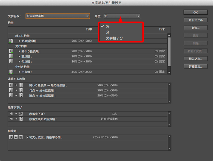 [文字組みアキ量設定]の[基本設定]ダイアログ。単位には[%][分][文字幅/分]のいずれかを使用できます。なお、[分]や[文字幅/分]では設定できない細かな値を使用したい場合には[%]を使用します