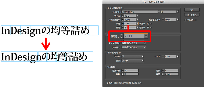 均等詰めで一番お勧めなのが、フレームグリッドを使用する方法です。[オブジェクト]メニューから[フレームグリッド設定]を選択し、[フレームグリッド設定]ダイアログの[字間]をマイナスに設定することで均等詰めが実現できます。英数字は詰まらず、和文のみが均等詰めされます。ただし、フレームグリッドに対してしか適用することができません。