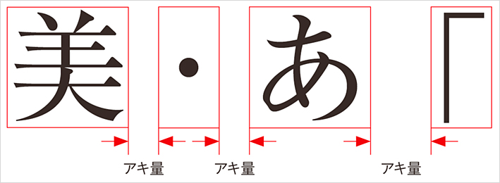図のケースでは、「美」と「・」のアキ量は「四分」、「・」と「あ」のアキ量は「四分」、「あ」と「始め鍵括弧」のアキ量は「二分」となっています