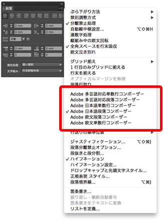 [段落]パネルのパネルメニューに用意されているコンポーザー