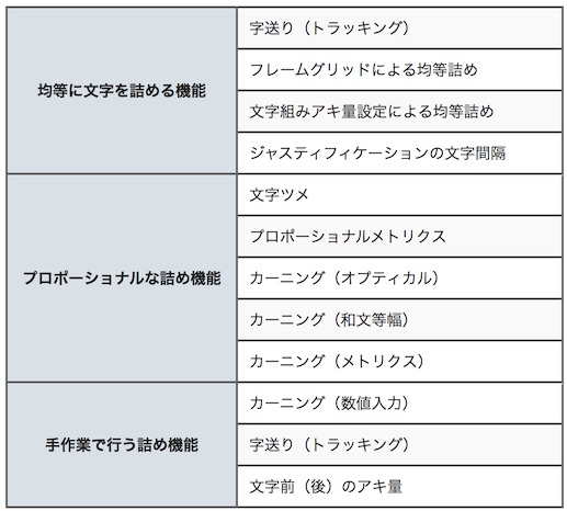 InDesignには、文字を詰めるためのさまざまな機能が搭載されており、用途に応じた詰めが実現できます。InDesignで使用可能な詰め機能を表にしたので参照してください。
