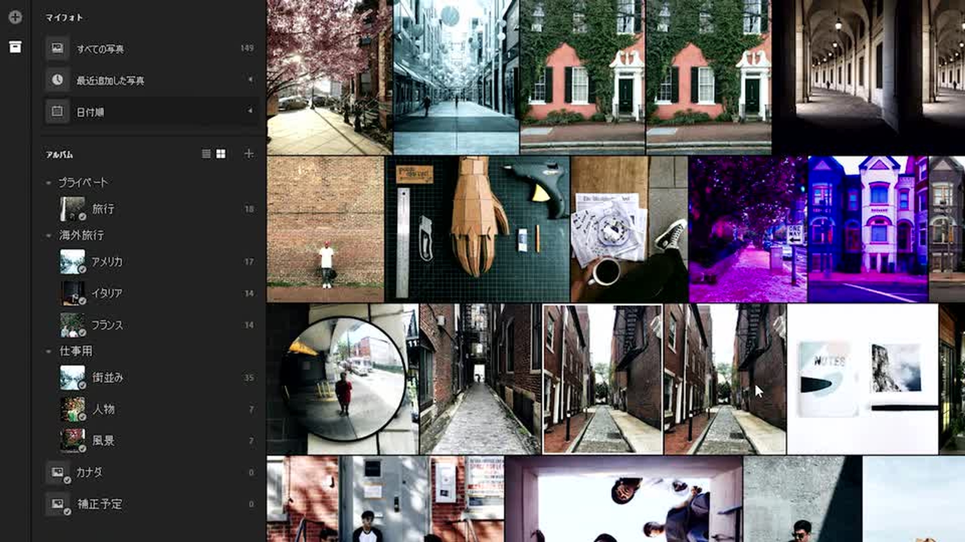 写真を編集する時や、共有する時など、目的の写真をすぐに見つけ出したいものです。このステップでは、一眼レフカメラやスマートフォンなどで撮りためた写真を、Lightroomを使って簡単に管理・整理する方法をご紹介します。また、写真を共有するための便利な機能が備わっていますので、こちらの使い方もぜひマスターしておきましょう。