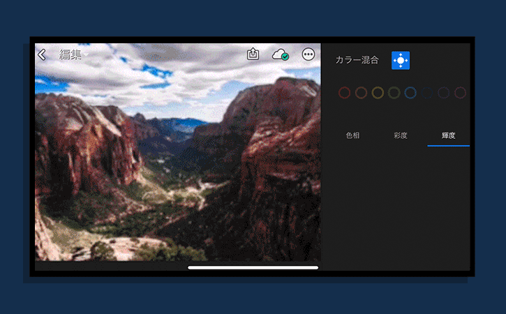 カラーミキサーパネルにあるスライダーを使用して特定のカラーを調整すると、写真内のそのカラーすべてに反映されます。円のアイコンは、それぞれ別の色域を表しています。円のアイコンをタップして補正する色域を選択します。