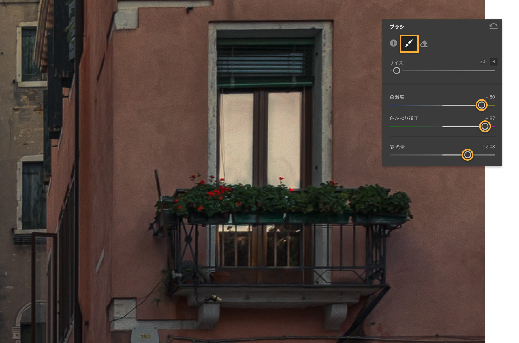 ブラシツールを使用して、画像の一部分を明るくします。調整する領域に合わせてブラシサイズを設定し、窓をブラシでなぞります。 キーボードのOキーを使用して、赤のオーバーレイの表示を切り替え、ブラシでなぞった領域を確認します。