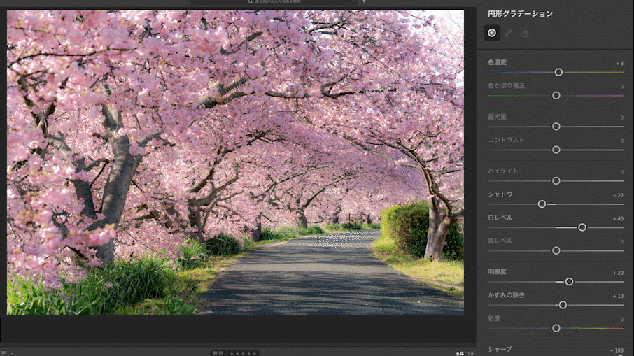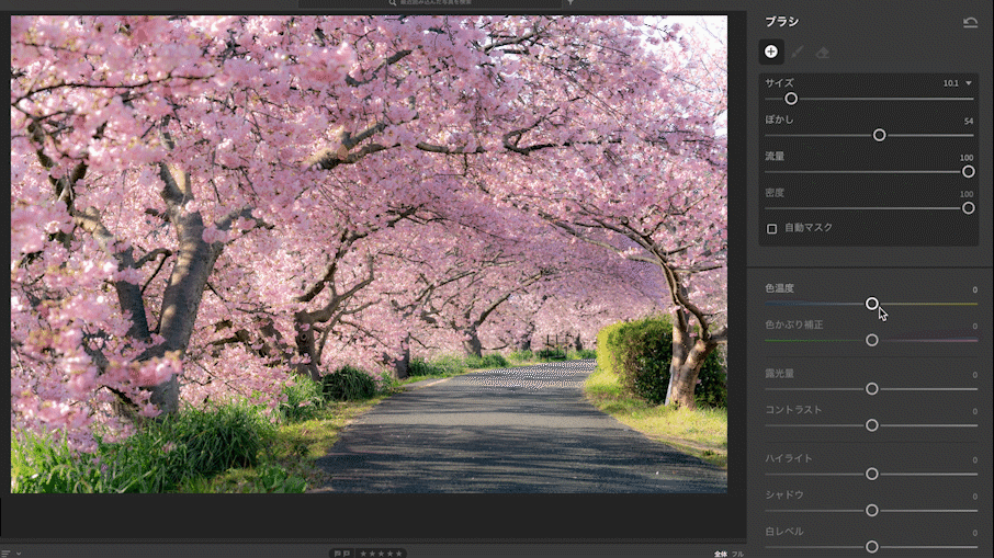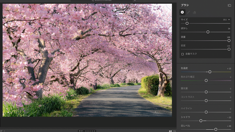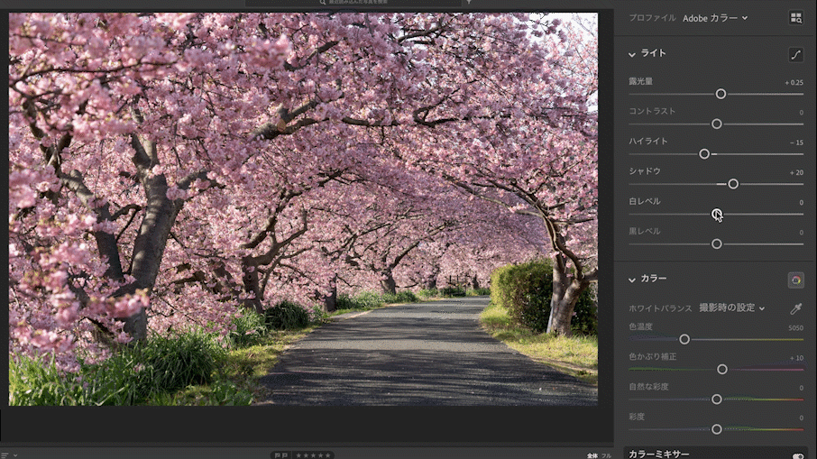 同じく右パネルの[編集]→[ライト]→[白レベル]のスライダーを右にドラッグします。