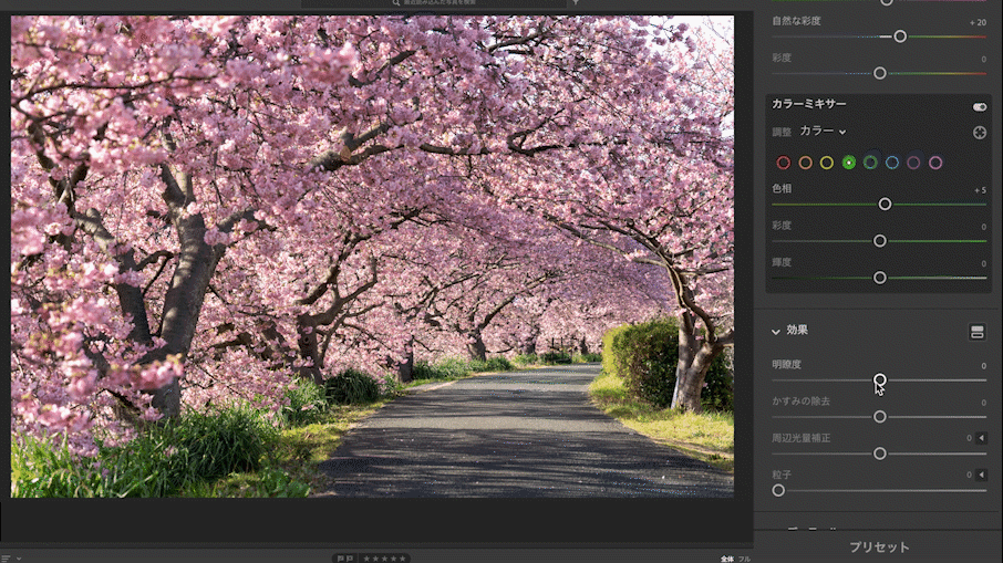 右パネルの[効果]→[明瞭度]のスライダーを左にドラッグします。色の差がある部分のコントラストが弱まり、滑らかな印象になりました。