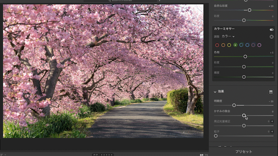 右パネルの[編集]→[効果]→[かすみの除去]のスライダーを右にドラッグします。