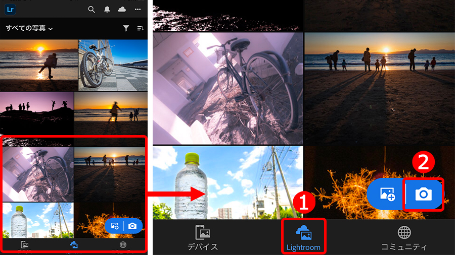 カメラ機能を起動するときは、写真一覧画面の右下にある、①Lightroomのアイコンをタップして、②カメラアイコンをタップします。