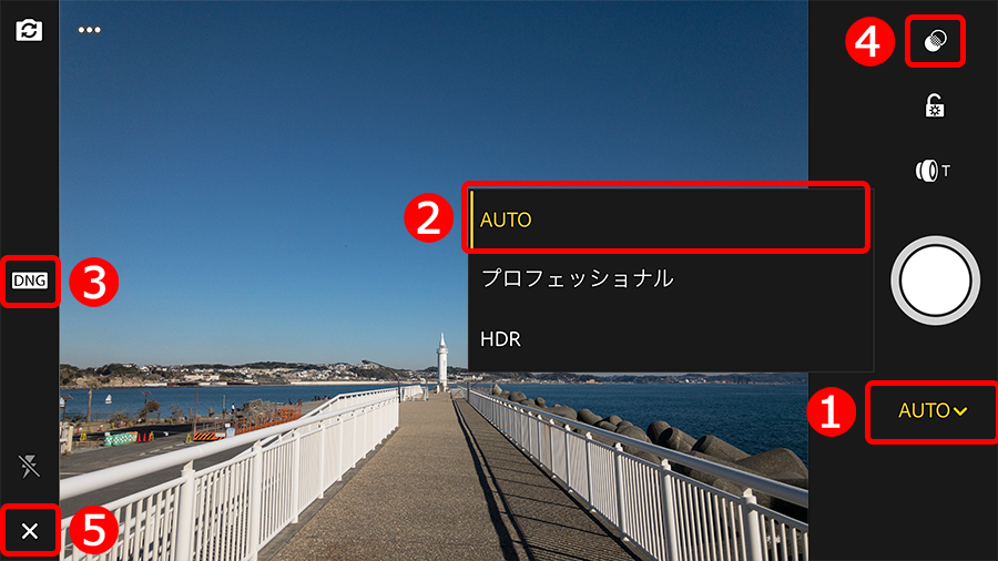 写真の形式は、③をタップすると選択できます。写真を編集するなら「DNG」形式がおススメですが、スマホの機種によっては選択できない場合もあります。