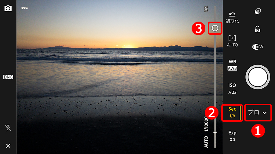 たとえばシャッター速度を自分で決めたい場合、カメラ機能を起動したら、①をタップして「プロフェッショナル」を選択し、②「Sec」をタップして、③表示されたスライダーでシャッター速度を決めます。