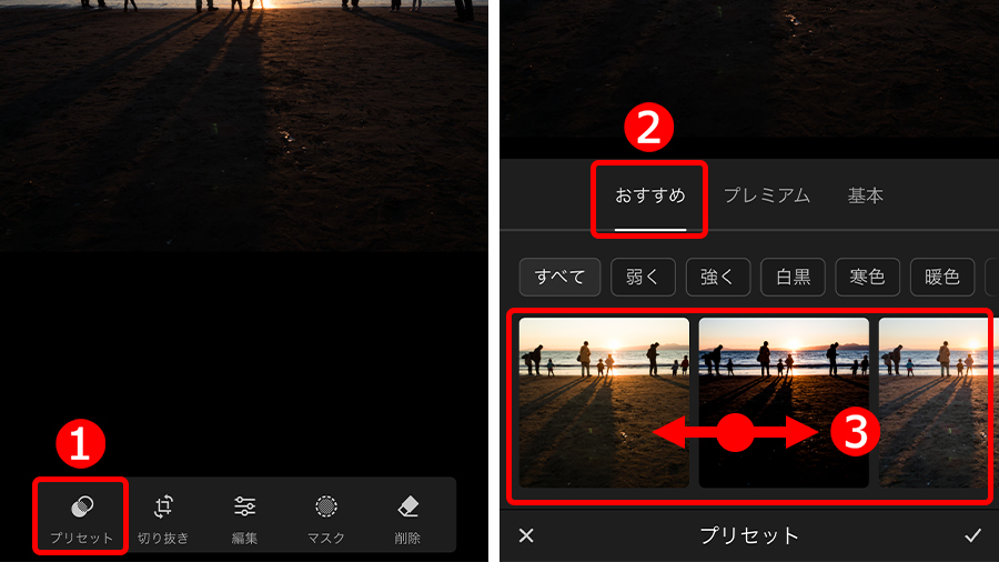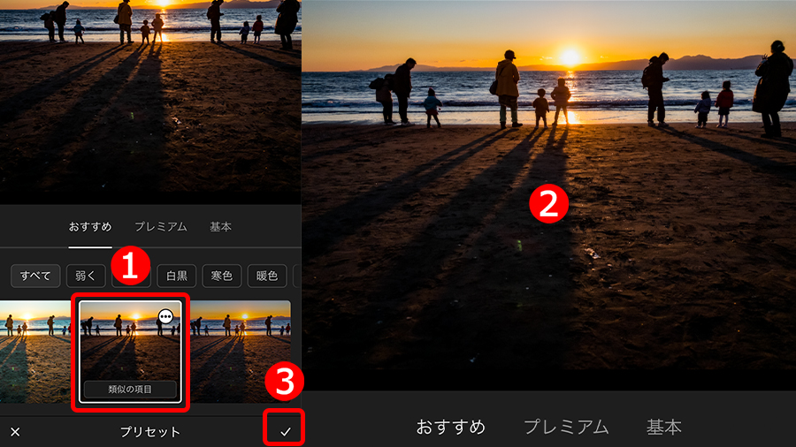 「プリセット」画面に切り替わったら、②「おすすめ」をタップするとAIが写真を解析して、その写真に合うバリエーションをいろいろと提案してくれます。