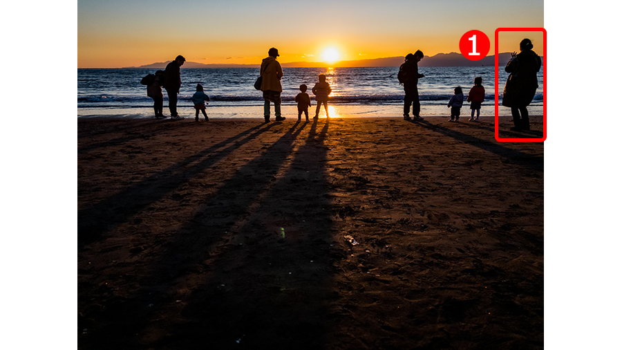 色調整は完了したのですが、①画面の右隅に写っている人物が枠に迫っていて窮屈で、バランスが悪く感じます。