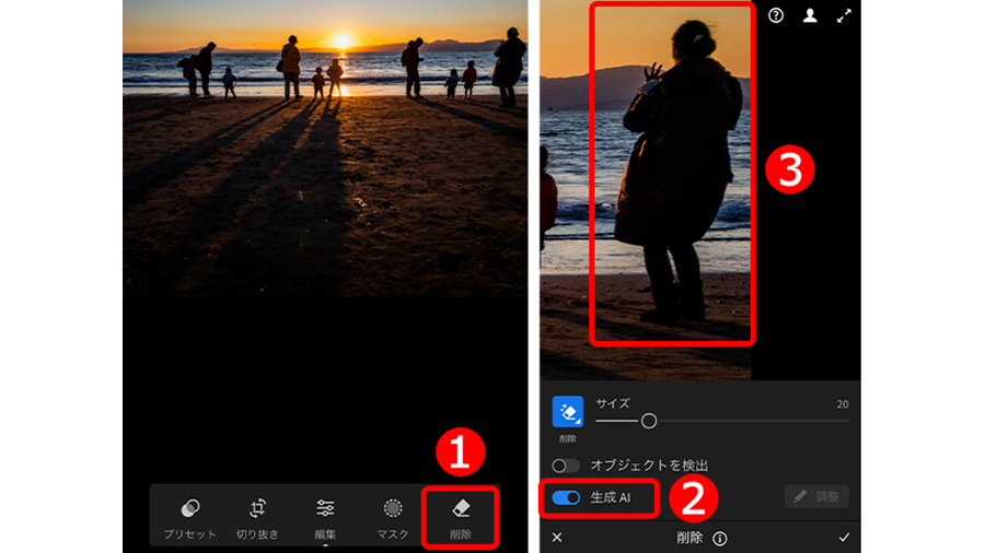 ①「削除」ボタンをタップして、画面が切り替わったら、②「生成AI」機能をオンにします。