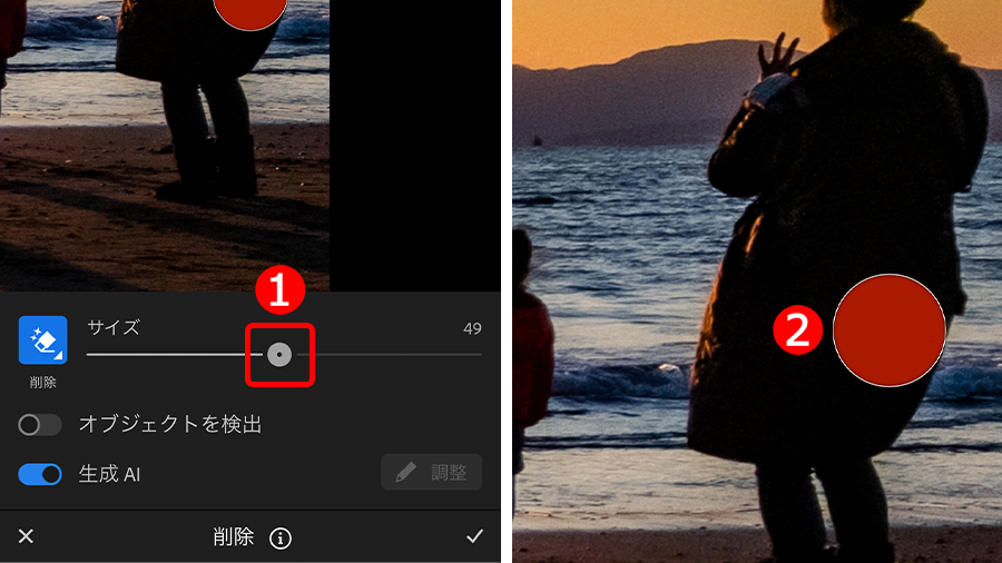 ①「サイズ」スライダーを動かして、②消したい部分を塗りつぶしやすいサイズに調整します。