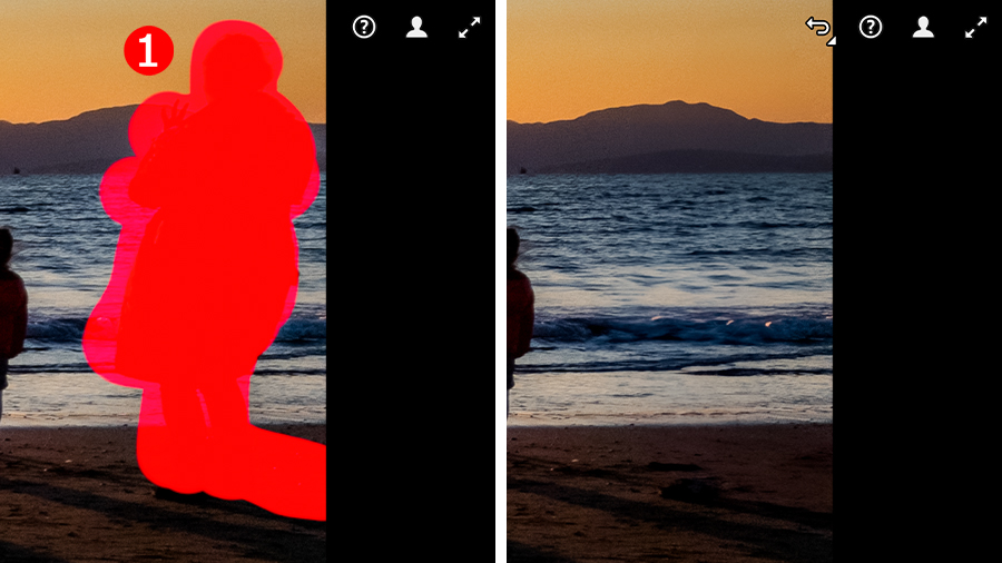 なにより驚いたのは、人物を消去した後の描写です。隠れて見えなかった「山の稜線」や「海面の波」などがきれいにつながっているのです。
