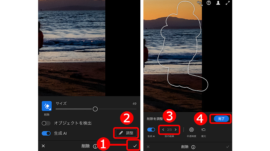 背景のつながりなどに違和感があるときは、②「調整」ボタンをタップして、③「別の結果」にある「<」「>」ボタンで自然に見える結果を探します。