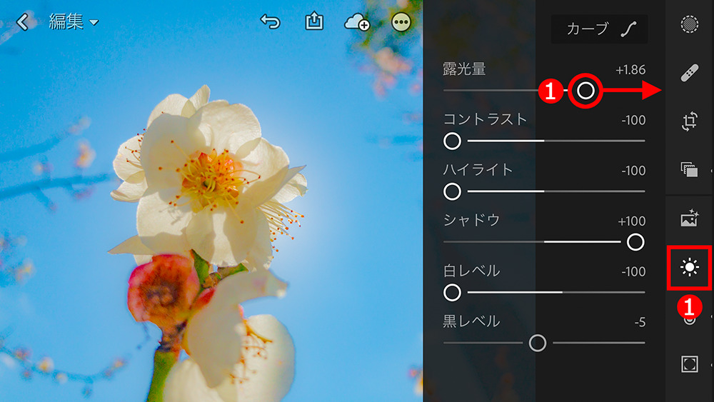 ①「ライト」ボタンをタップして機能を表示したら、②「明るさ」スライダーを再調整。この写真は、スライダーを右に移動して明るい色彩に仕上げました。