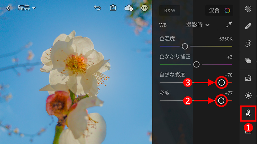 先に、②「彩度」スライダーを右に移動して全体を鮮やかにしてから、③「自然な彩度」スライダーを右に移動して足りない発色を補います。
