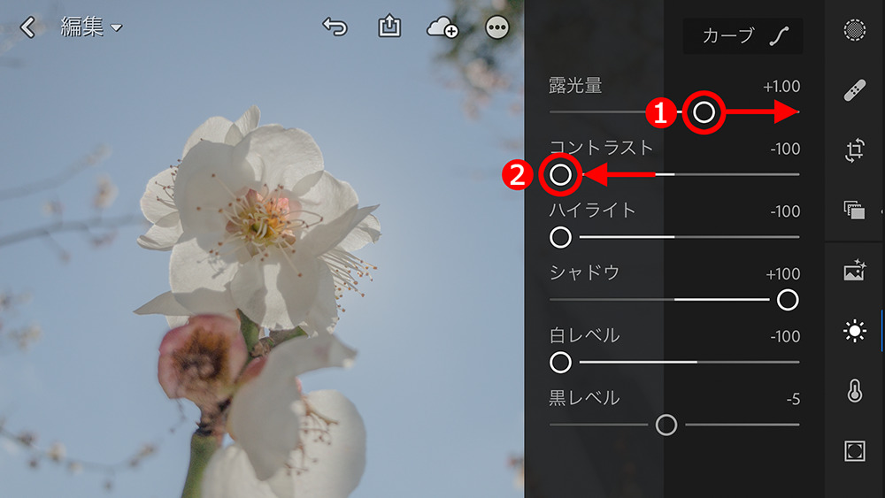 ①「明るさ」スライダーを右に移動して明るく補正し、②「コントラスト」スライダーを左に移動してやわらかな描写にします。