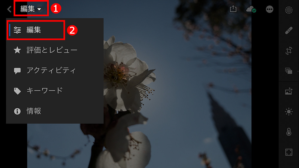 サムネール一覧で写真をタップして大きく表示したら、①左上の文字の部分をタップ。表示された一覧から、②「編集」を選ぶと編集画面で表示できます。