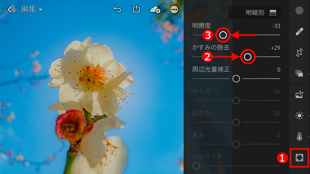 さらに、花の写真は、③「明瞭度」スライダーを左に移動して紗のかかったようなやわらかな描写にすると効果的です。