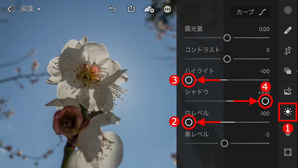 ①「ライト」ボタンをタップしたら、②「白レベル」と③「ハイライト」スライダーを左に移動します。これで、強い光が弱くなるような効果が得られます。