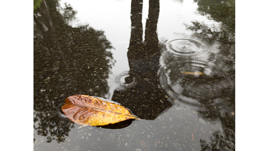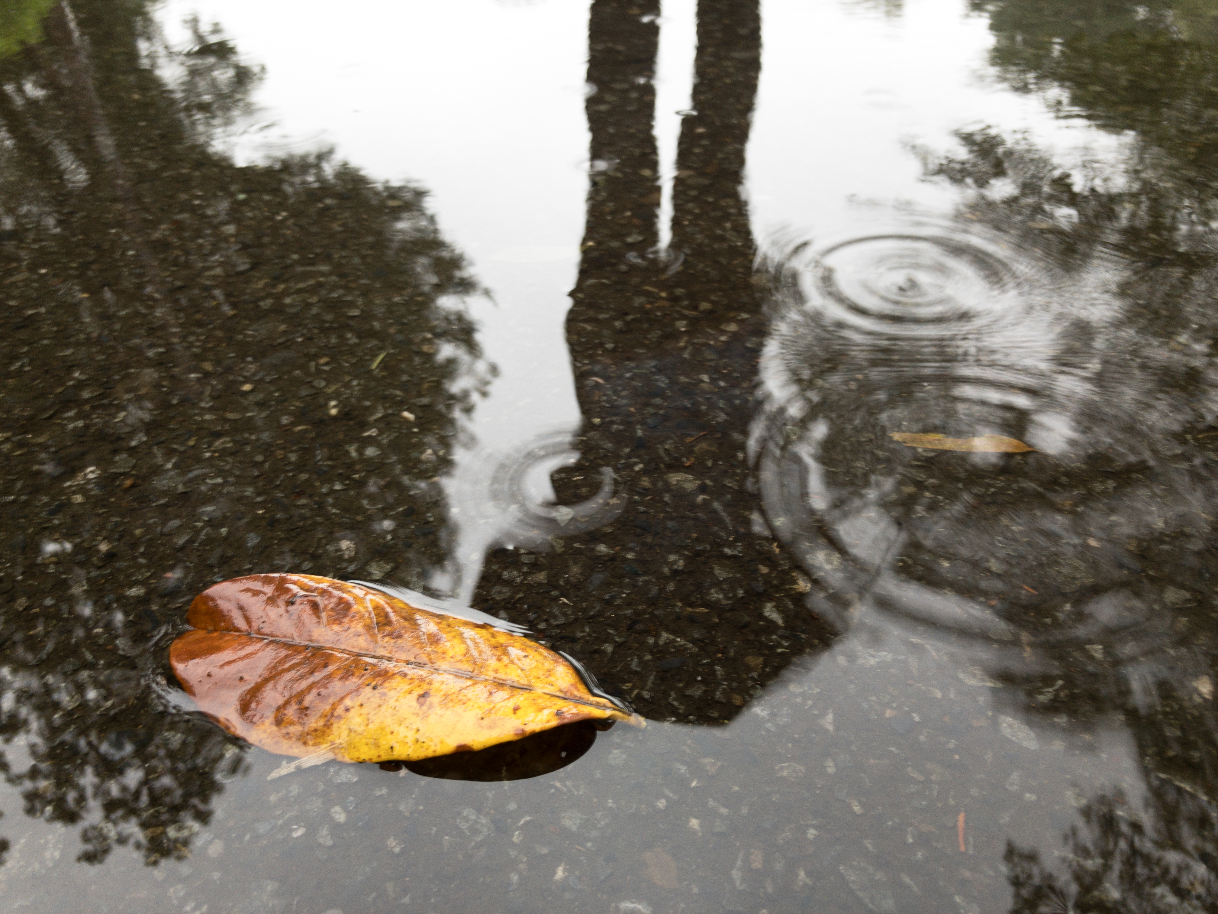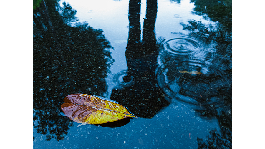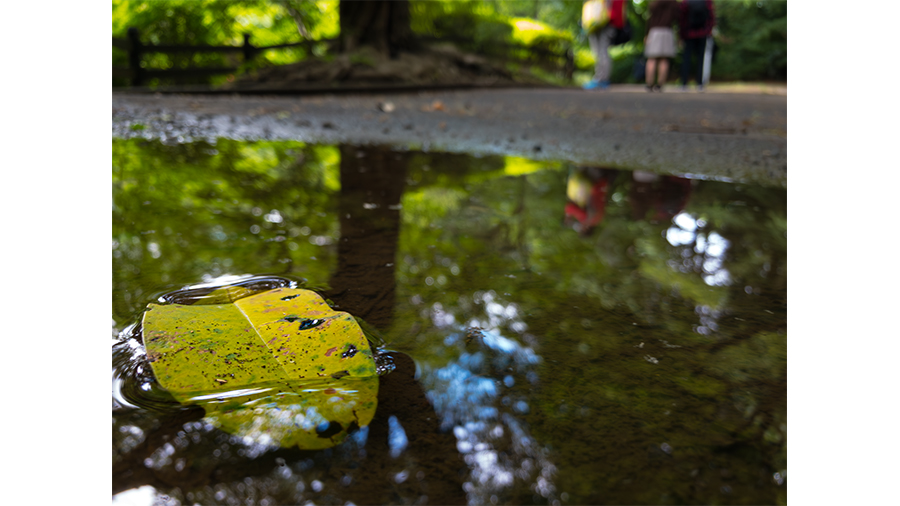 散策中にいい感じの水たまりを見つけたので、木の葉を置き、傘を持った同行人を反射して、水滴が落ちたタイミングで撮影しました。