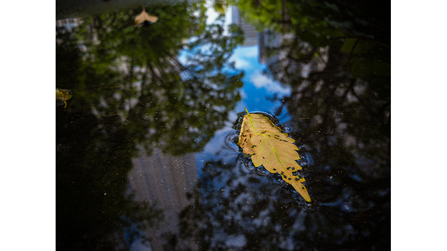 下の写真は、水たまりに木の葉を浮かべて、その背景として反射した空と木々を写し込みました。反射だけを写すよりも見応えのある写真になったのではないでしょうか。