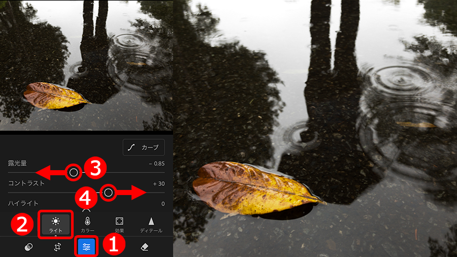 ①「編集」ボタンをタップして、②「ライト」ボタンをタップ、③「露光量」を左に移動して少し暗めの状態にします。