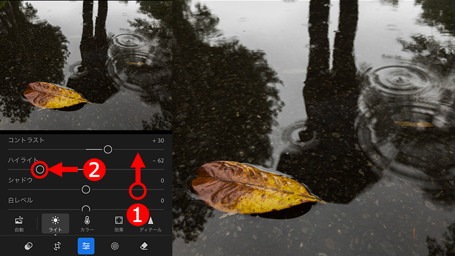 写真の白い部分(画面上部)は色がつきにくいので、①スライダー部分を上にスライドして下にある機能を表示し、②「ハイライト」を左に移動して明るい領域を重点的に暗く補正します。