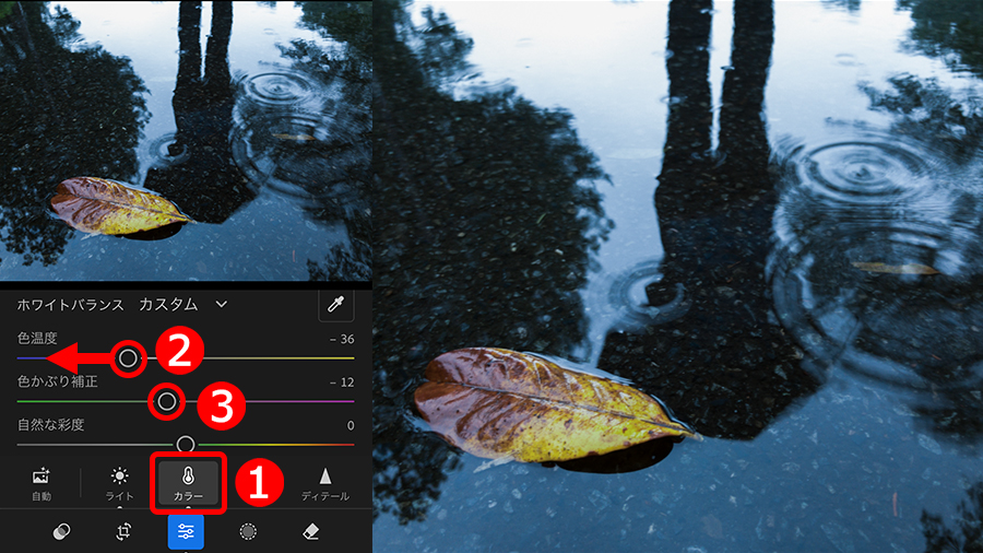 雨と水の印象を強くするために、全体の色みを青っぽく偏らせます。使う機能は「色温度」です。