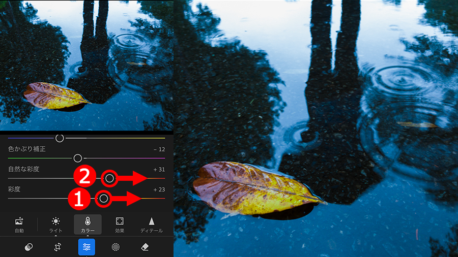 色の濃さの基となる「暗めの露出」は作ってあるので、ここでは、①「彩度」と、②「自然な彩度」を右方向に移動し、鮮やかさを増すことで発色のよい色彩を再現。