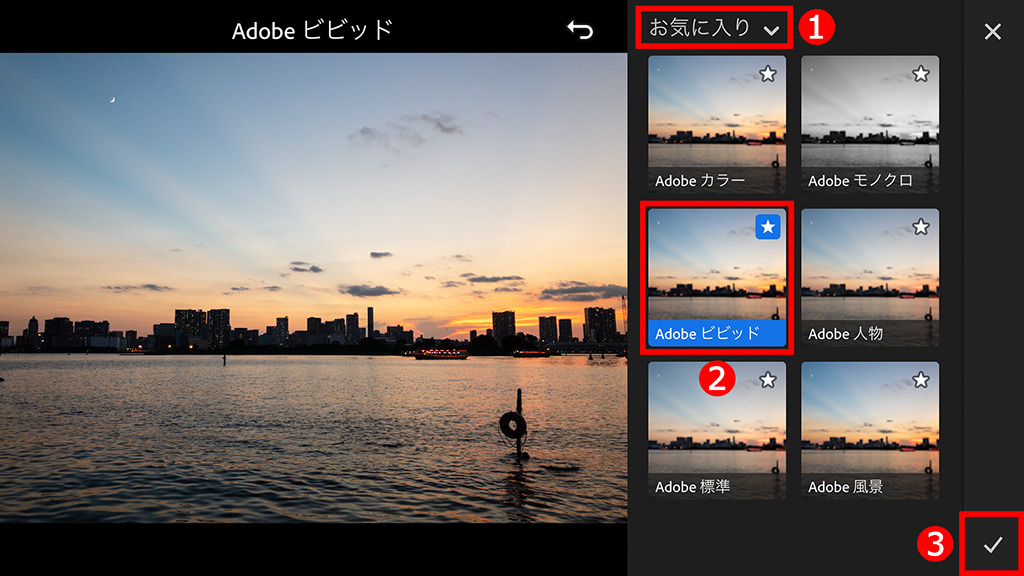①「お気に入り」の項目にある、②「Adobeビビッド」をタップして選択しました。これで、写真の基本的な色彩がビビッドな状態(発色のよい色)に調整されます。