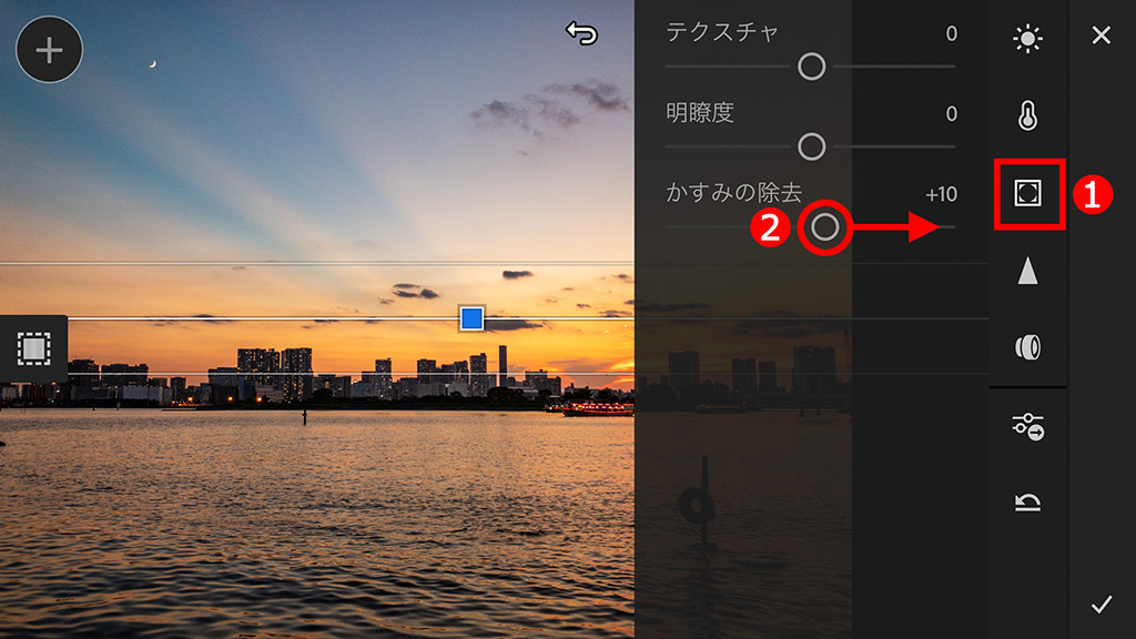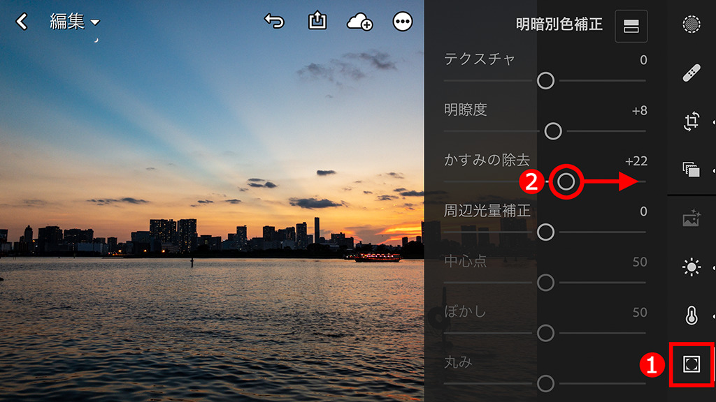この写真はもう少し色濃くしたいと思ったので、①「効果」ボタンをタップして、②「かすみの除去」スライダーを右に移動しました。