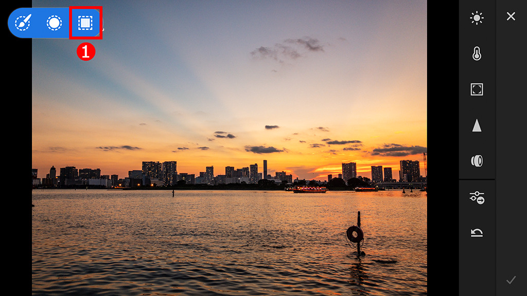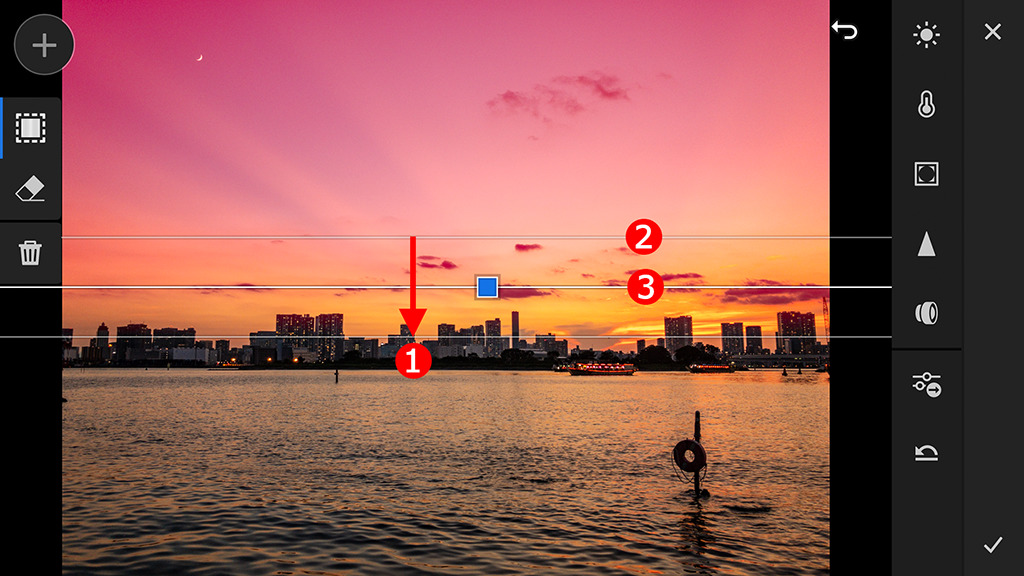 ここでは、空の高い部分に向かって徐々に色濃くしたいので、グラデーションのように補正できる、①のボタンをタップします。