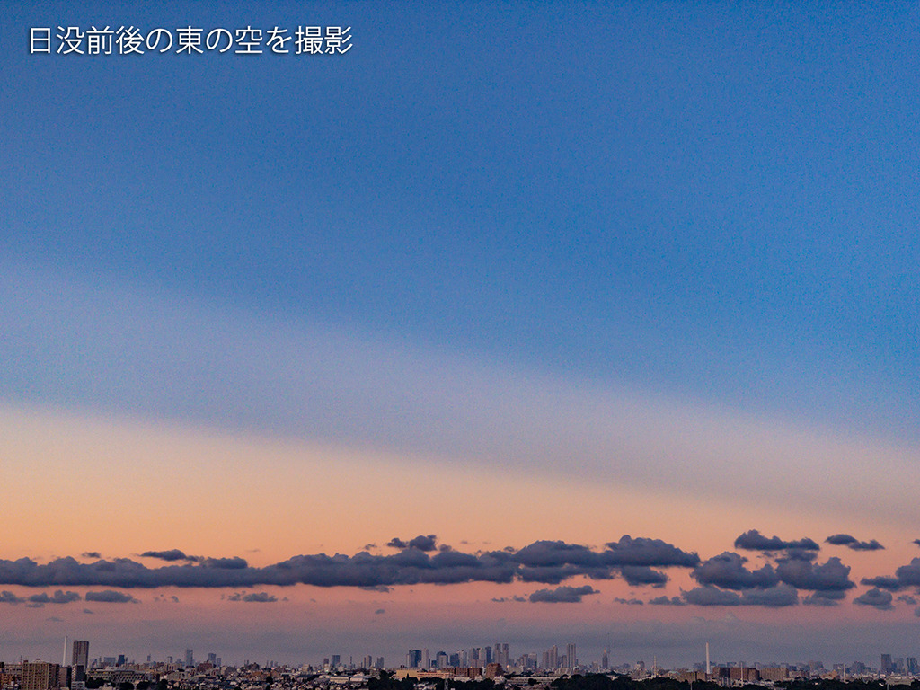 それと、太陽が沈む方向とは異なる方角に目を向けると、下の写真のようにやさしい色彩で段階状に伸びる光の筋を写すこともできます。もちろん、気象条件によりますが。