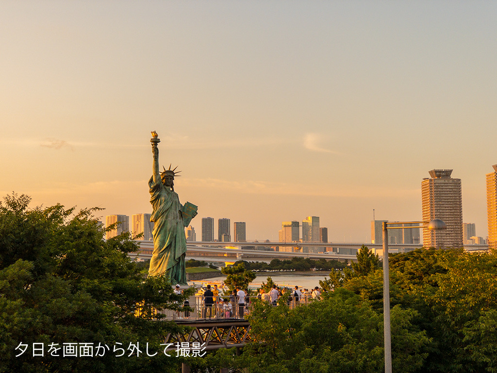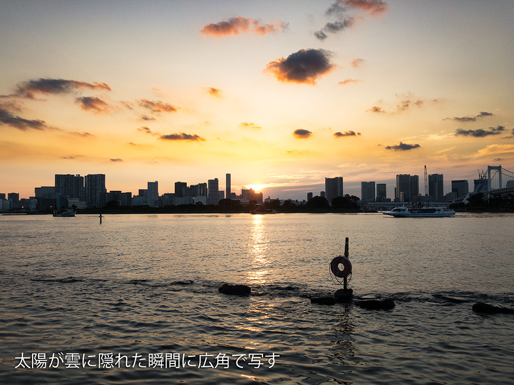 夕暮れのシーンというと、オレンジ色の太陽と黄金色の空をイメージするかもしれませんが、実際に太陽を写すと「白い球」になってしまい、ちょっと興ざめです。