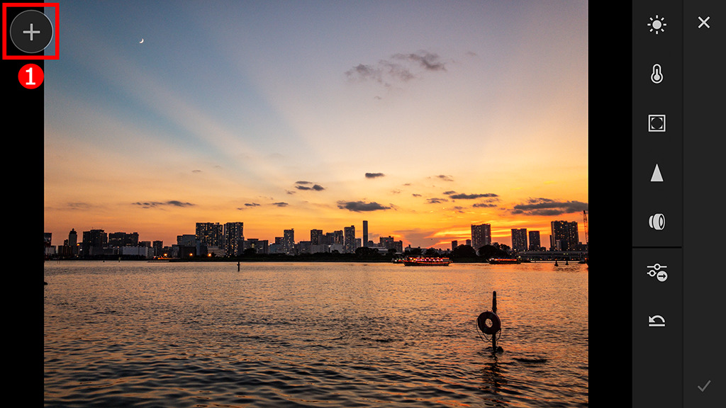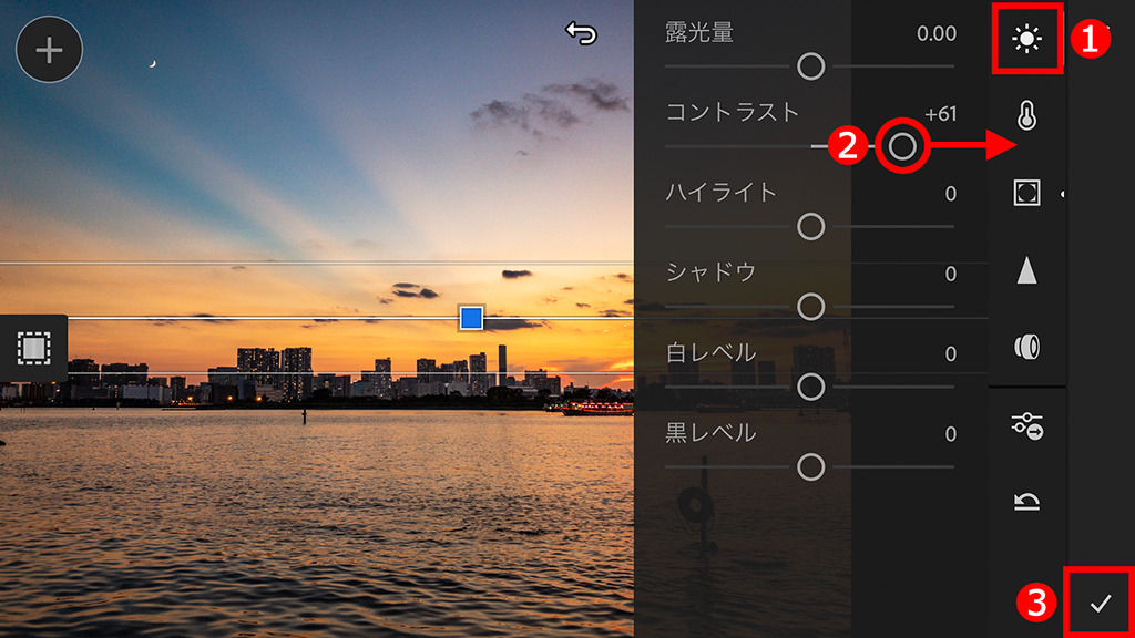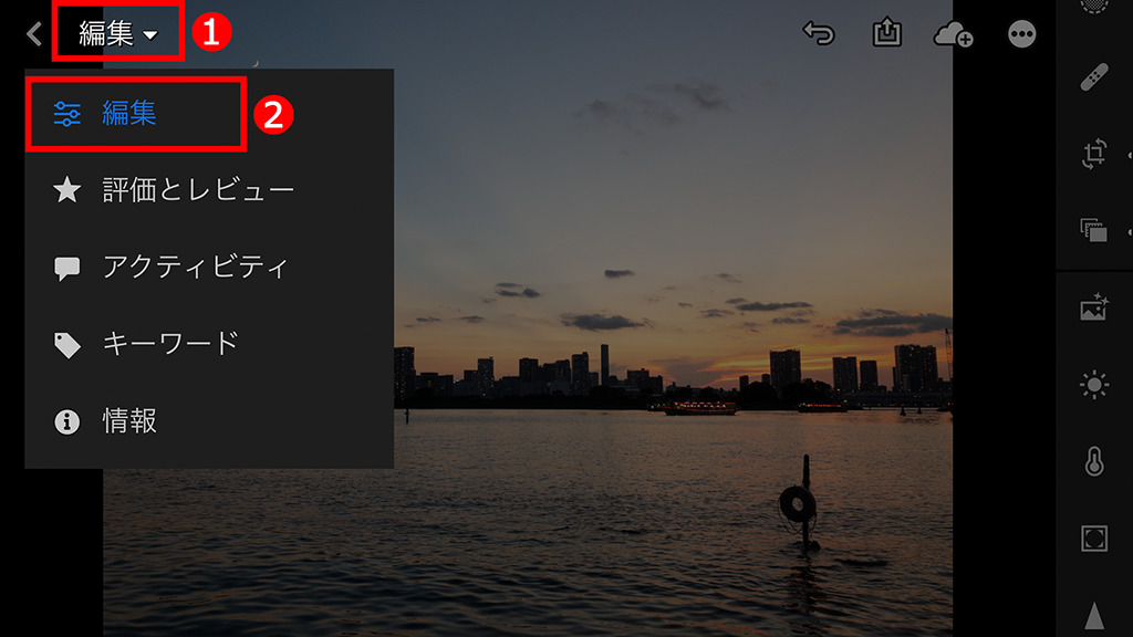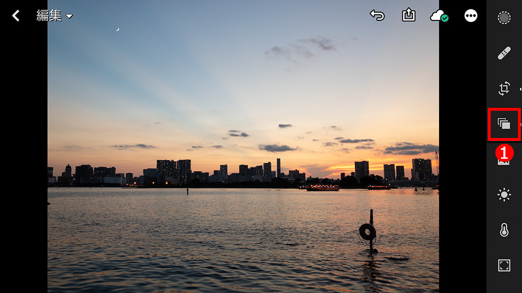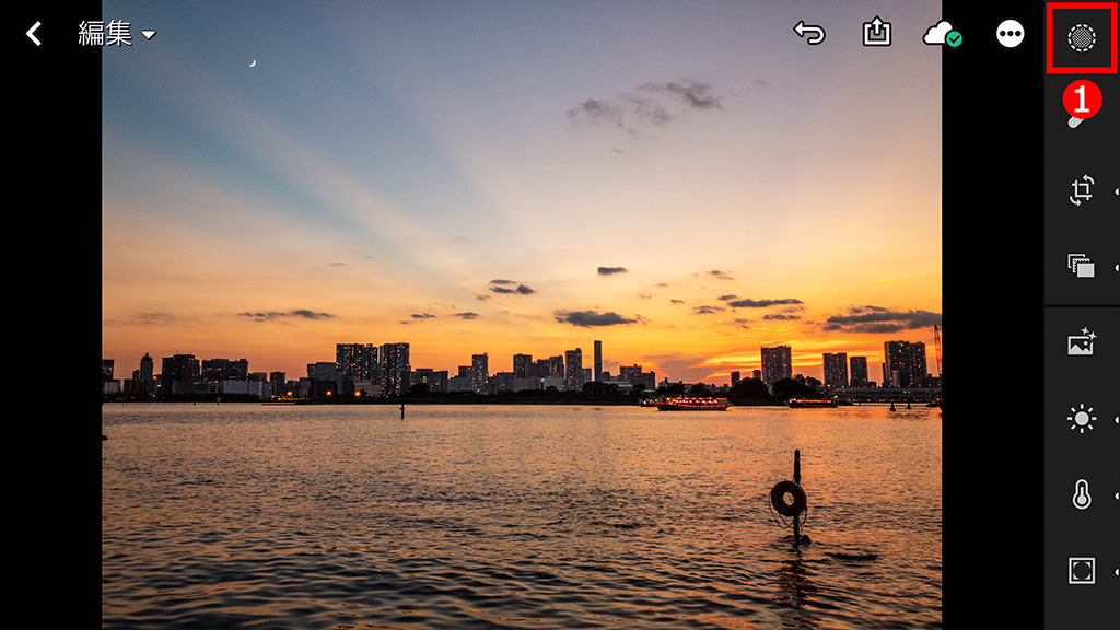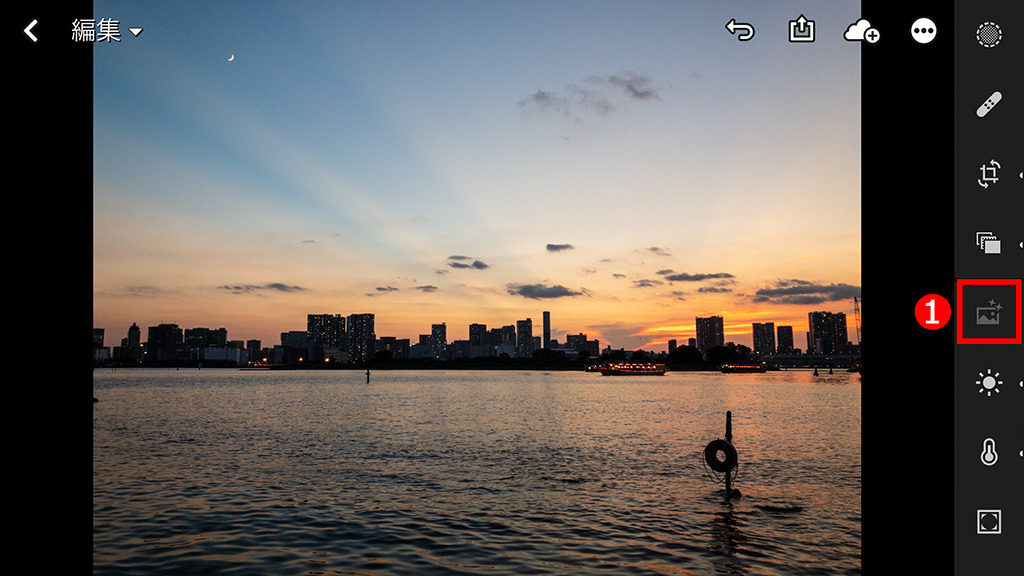 まずは、①「自動」ボタンをタップして自動補正を実行します。これで、Lightroomが写真を解析して、明暗や色彩を整えた状態にしてくれます。