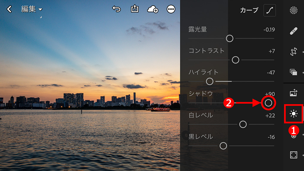使う機能は、①「ライト」ボタンにある、②「シャドウ」スライダーです。右方向に動かすと陰のように暗い部分が明るくなって、ディテールが見やすくなります。