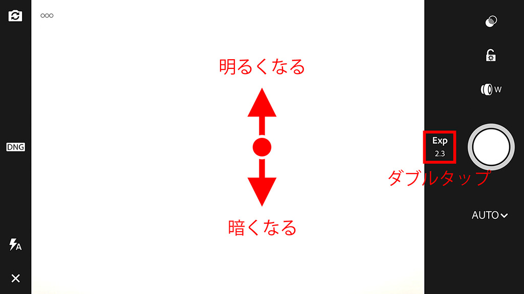 明るく写したいときはカメラ画面で指を上(スマホを縦に構えたときは右)、暗く写すときは下(同、左)にスライドします。「Exp」の文字をダブルタップすれば、元の明るさに戻せます。
