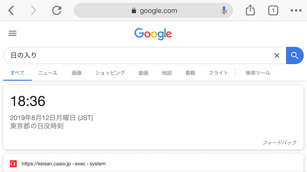 ①の日の入り時刻に関しては、スマホで検索すると簡単です。位置情報がオンになっていれば、ブラウザで「日の入り」と検索すれば確認できます。